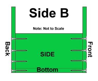 Step A - Place the "BOTTOM" on your workbench and attach "SIDE A" and "SIDE B" to the base using 1-5/8" galvanized deck screws. The screws should go through the "SIDE PIECES" into the "BOTTOM".